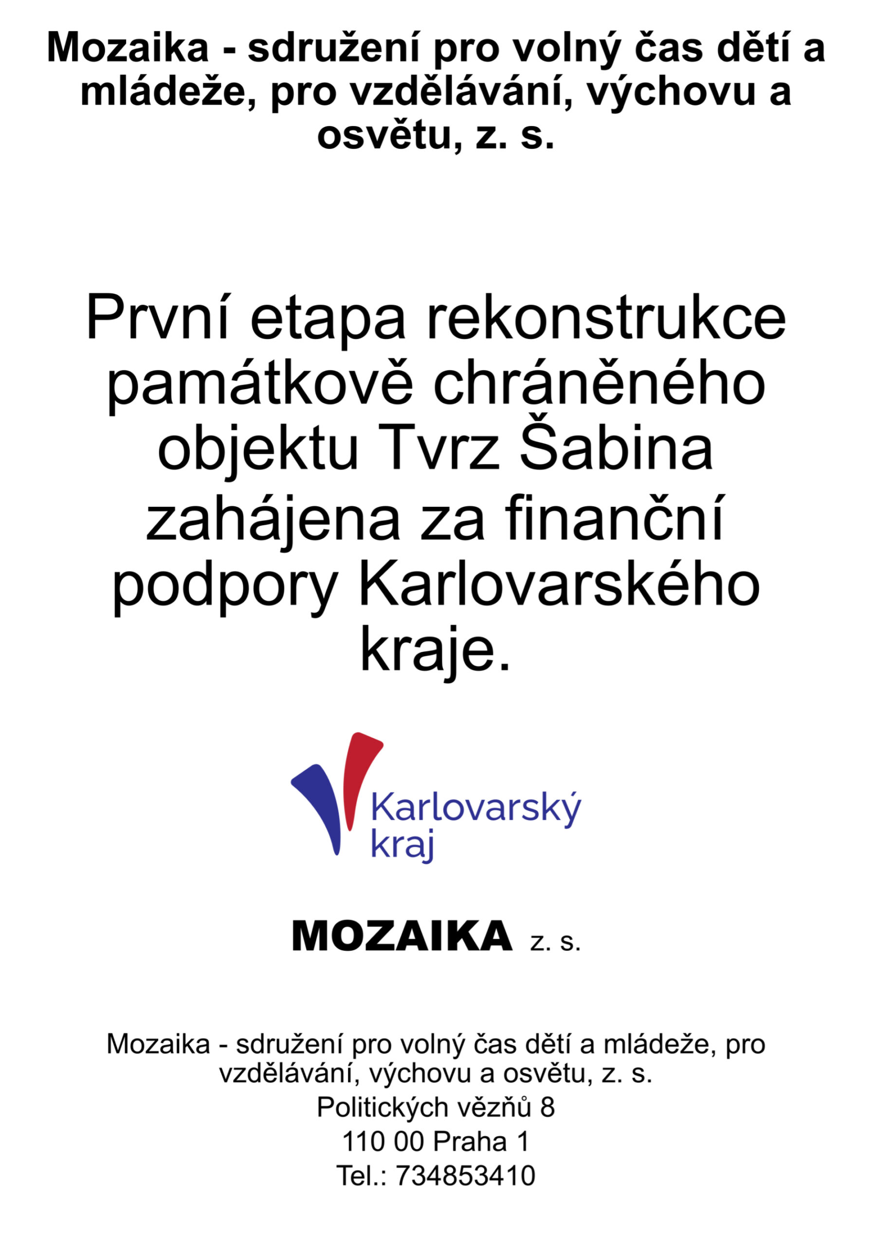 Projekt rekonstrukce a záchrany objektu tvrze Šabina. Stavba, zapsaná v registru kulturních památek, zůstala dlouhá léta bez pozornosti odborných institucí. Náš spolek Mozaika zakoupil tento objekt za účelem vytvoření multifunkčního kulturního zařízení, které by umožňovalo celoroční využití. Jeho náplní budou aktivity pro obyvatele obce a regionu, později širšího okolí. Budou se zde pořádat kulturní a společenské akce typu malba v plenéru pro mladé výtvarníky, výstavy malířů, fotografů a dalších umělců, hudební a pěvecké koncerty koncerty . V prostorách tvrze bude knihovna, muzeum osobností kulturního a společenského života. Počítá se s malou ubytovací kapacitou a prostory pro pořádání společenských akcí typu svatby, komunitní setkávání apod. V budoucnosti jsou plánovány malé akce s mezinárodní účastí. Nezapomeneme ani na možnost využití v souvislosti se sportovními a turistickými aktivitami (objekt je nedaleko vodácky oblíbené řeky Ohře).